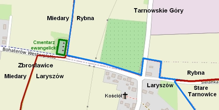 Zanim w 1928 r. poświęcono w Laryszowie nowo zbudowany kościół Stefana, tamtejsi protestanci cztery lata wcześniej w maju, uzyskali zgodę na założenie cmentarza. Znajduje się do dziś na terenie Miedar, a jego ogrodzenie od wschodu przylega do granicy z Rybną. Nie jest to jego jedyny związek z Tarnowskimi Górami.